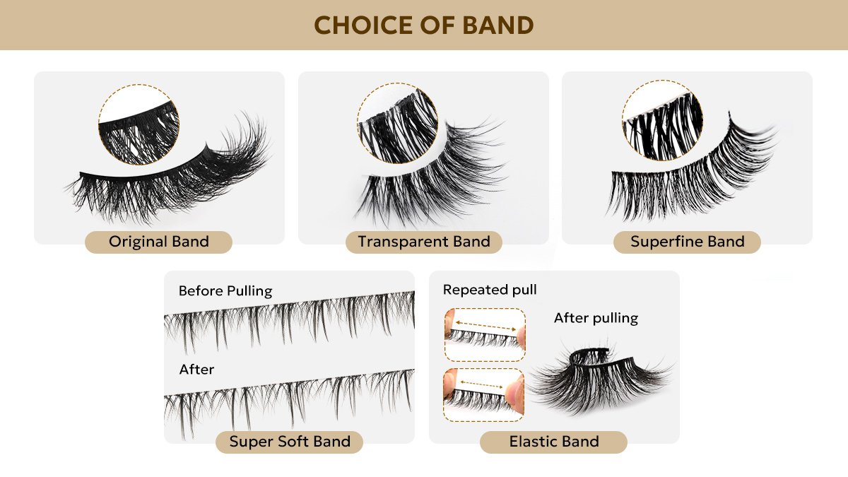 Mega Beauty supports full lash band customization, and we are able to supply all of the above band types to meet diverse wholesale and private label requirements.
